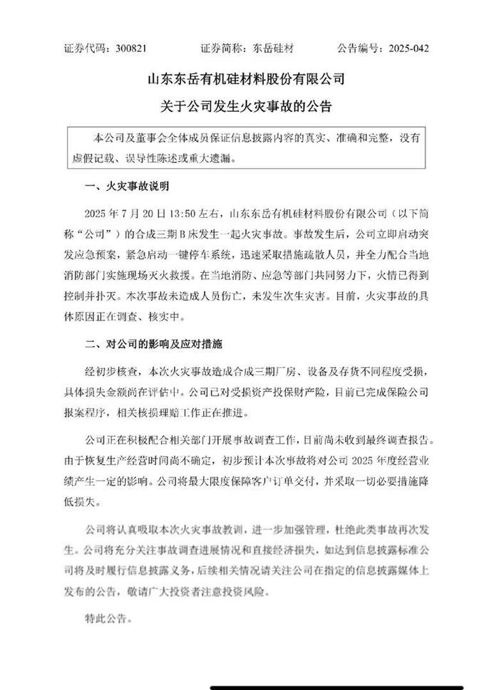 7月21日早晨,山东东岳有机硅材料股份有限公司(简称“东岳硅材”,300821 .SZ )发布公告称,7月20日13:50左右,公司的合成三期B床发生一起火灾事故。事故发生后,未有人员伤亡报告。